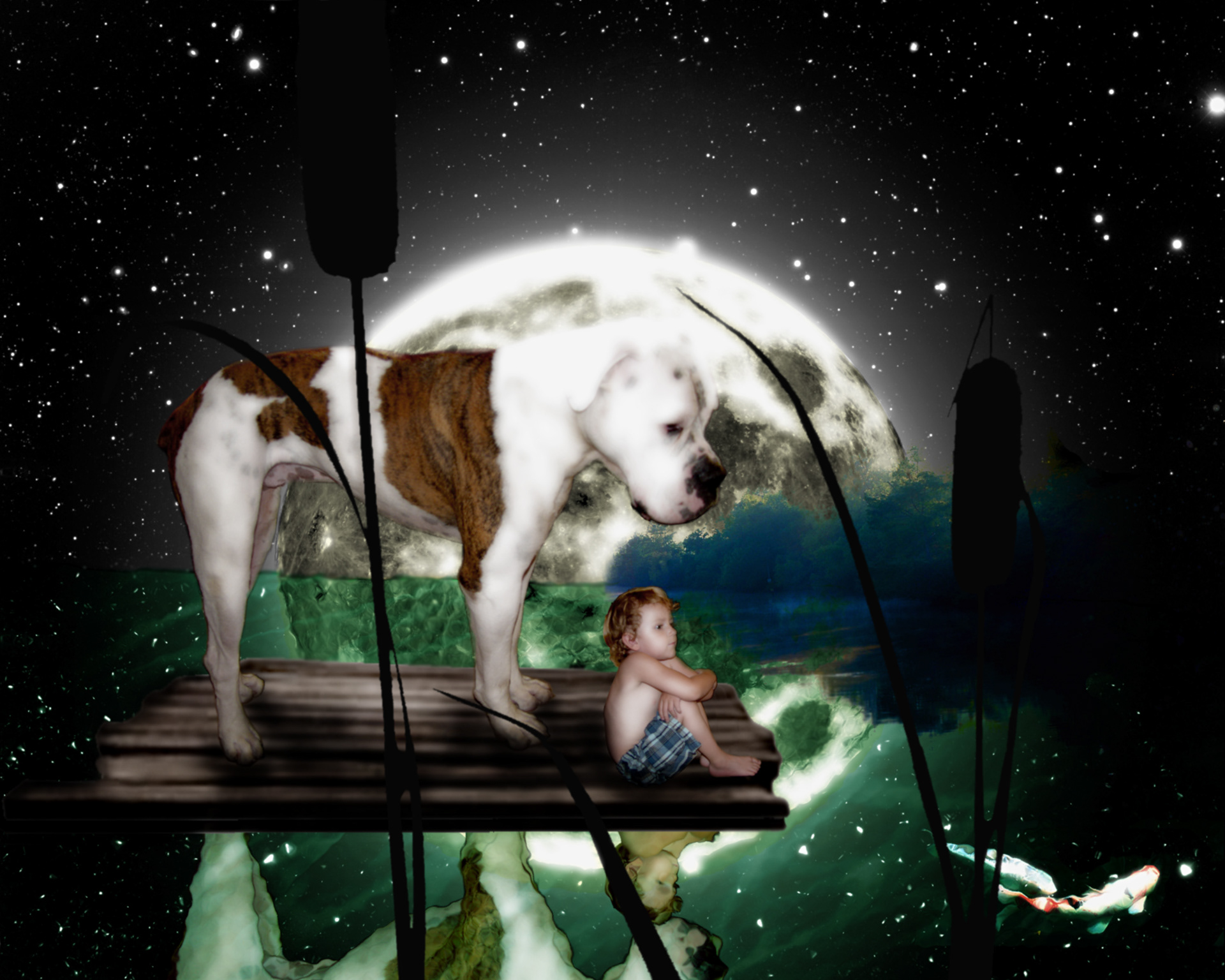 "Drexle & Phoenix" My Son, Phoenix and his best friend Drexle, our American Bulldog. A Photo Shop composite of eight images. I took individual photographs of Phoenix and Drexle in our living room under the same light and manipulated the glow filter in PS.
